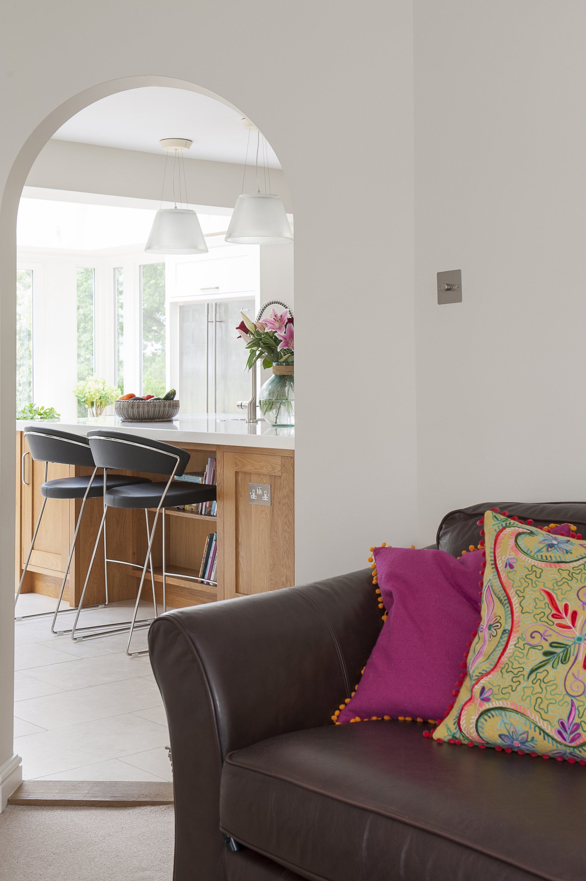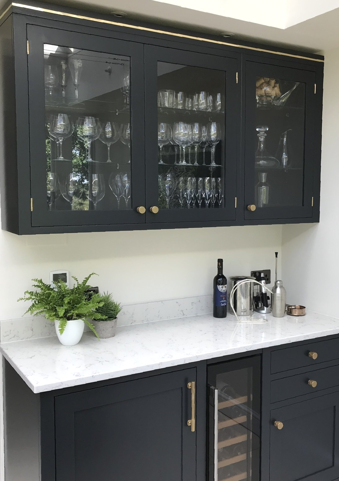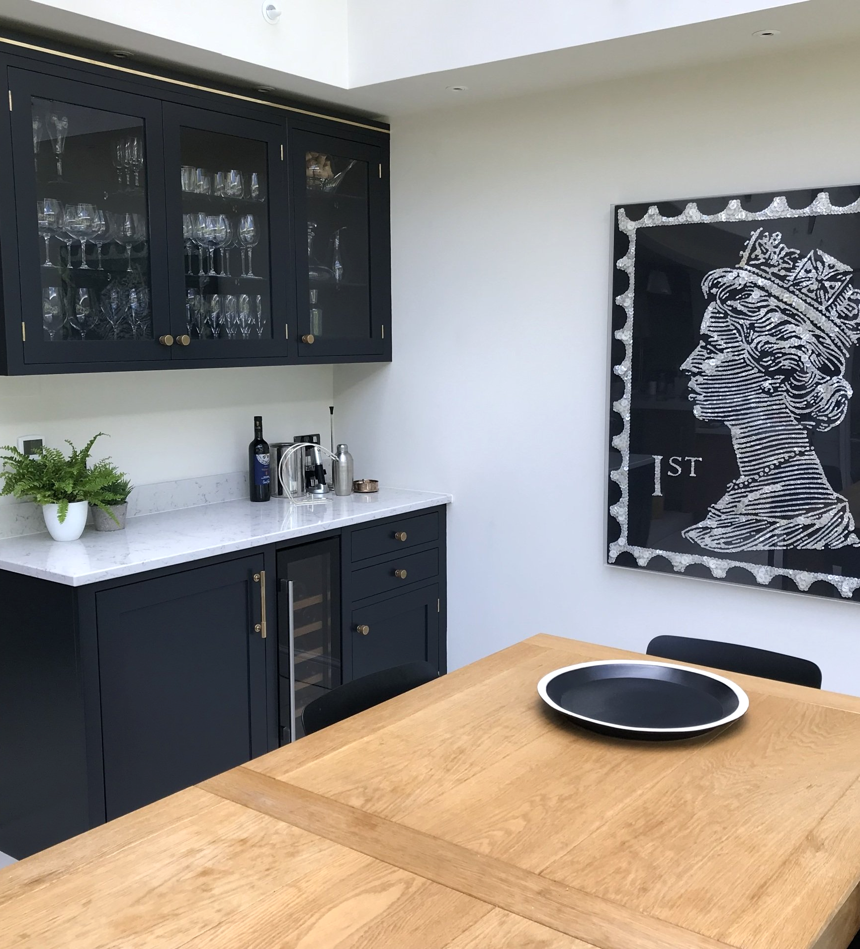 The property was extended by adding a light filled conservatory to enlarge the original kitchen to create a spacious kitchen dining room for entertaining, with space for a large table and chairs and a spiral wine cellar. We started with the full bespoke kitchen design, working from plans. Other rooms we have designed are the main living room with a scheme based around the client’s existing artworks, Hall, cloakroom and family TV room. We have more recently evolved the family admin/organisation area into a drinks station with new joinery and integrated wine and drinks fridges and display for glasses and wine tasting equipment and gadgets. Always lovely to return and update our projects.